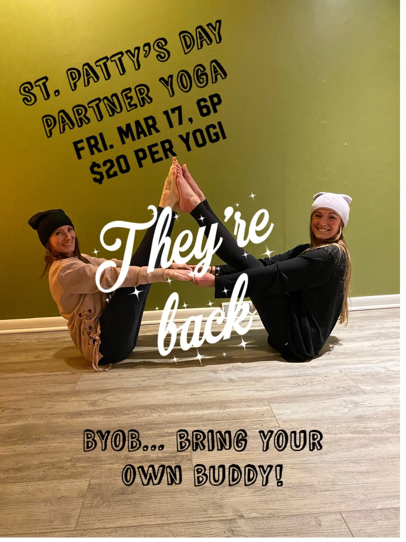 CANCELLED- Partner Yoga ($20 per yogi) Friday, March 17, 2023 6:00 PM 7:00 PM 18:00 19:00 Google Calendar ICS CANCELLED, be on the lookout for reschedule